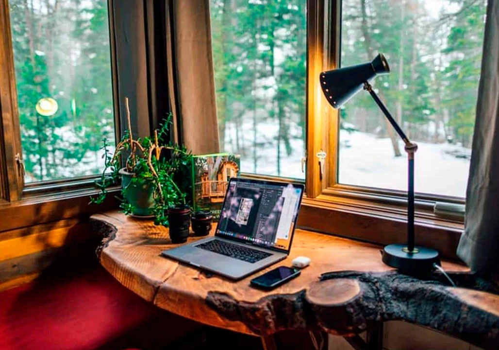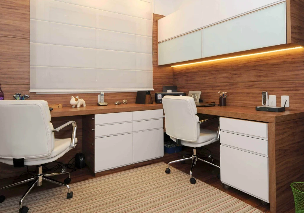 Na sua iluminação home office, você pode escolher colocar sua mesa na direção da janela, assim aproveita a luz do dia e economiza energia. Agora, se isso não for possível, é legal mesclar uma luz mais amarelada com uma mais puxada para o azulado, usando pequenos spots e arandelas distribuídos estrategicamente pelo cômodo.