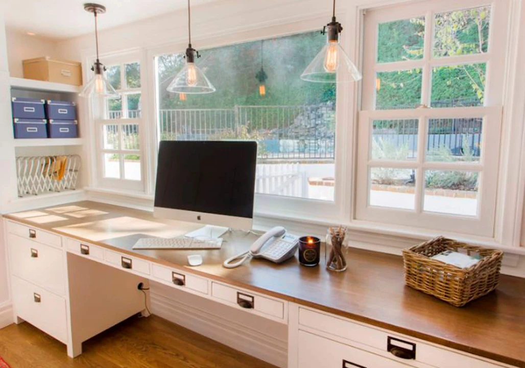 Se você quer aproveitar a luz do dia, precisa lembrar que ela costuma ofuscar a tela do computador, então posicione seu monitor contra a luz da janela. Se você for usar um pendente mais baixo para iluminar a mesa, a luz deve ficar sobre você, e não diretamente sobre a mesa, para evitar reflexos.