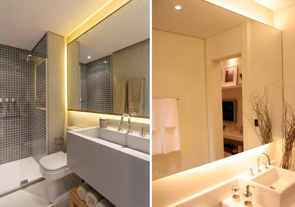 Também é interessante usar fitas de LED na borda do espelho ou sobre a bancada, que dão um toque ainda mais profissional e podem ser agregadas com qualquer outro estilo de iluminação para banheiro mencionado acima.
