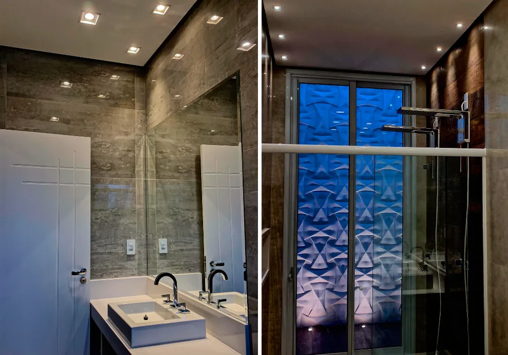 O foco principal costuma estar sobre a bancada da pia; evite spots por sobre a privada e, no espaço do banho, iluminação mais fraca e em tons quentes garante muito mais relaxamento.