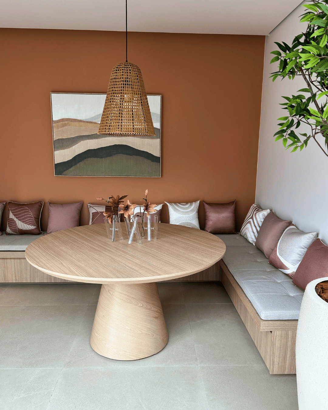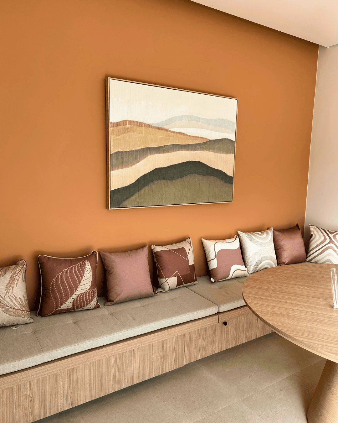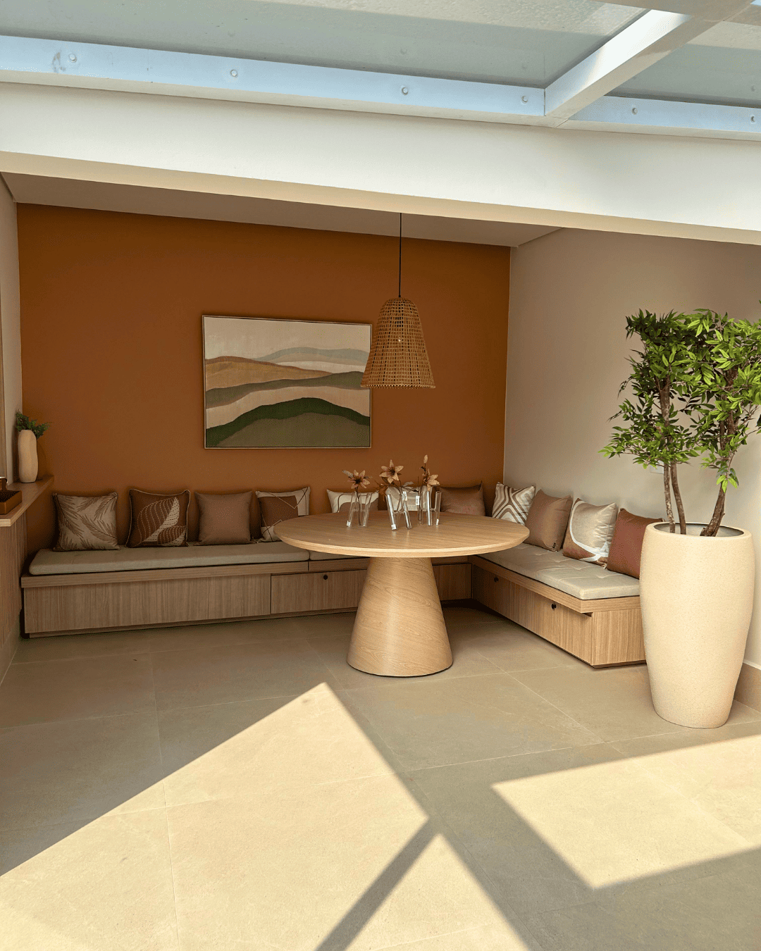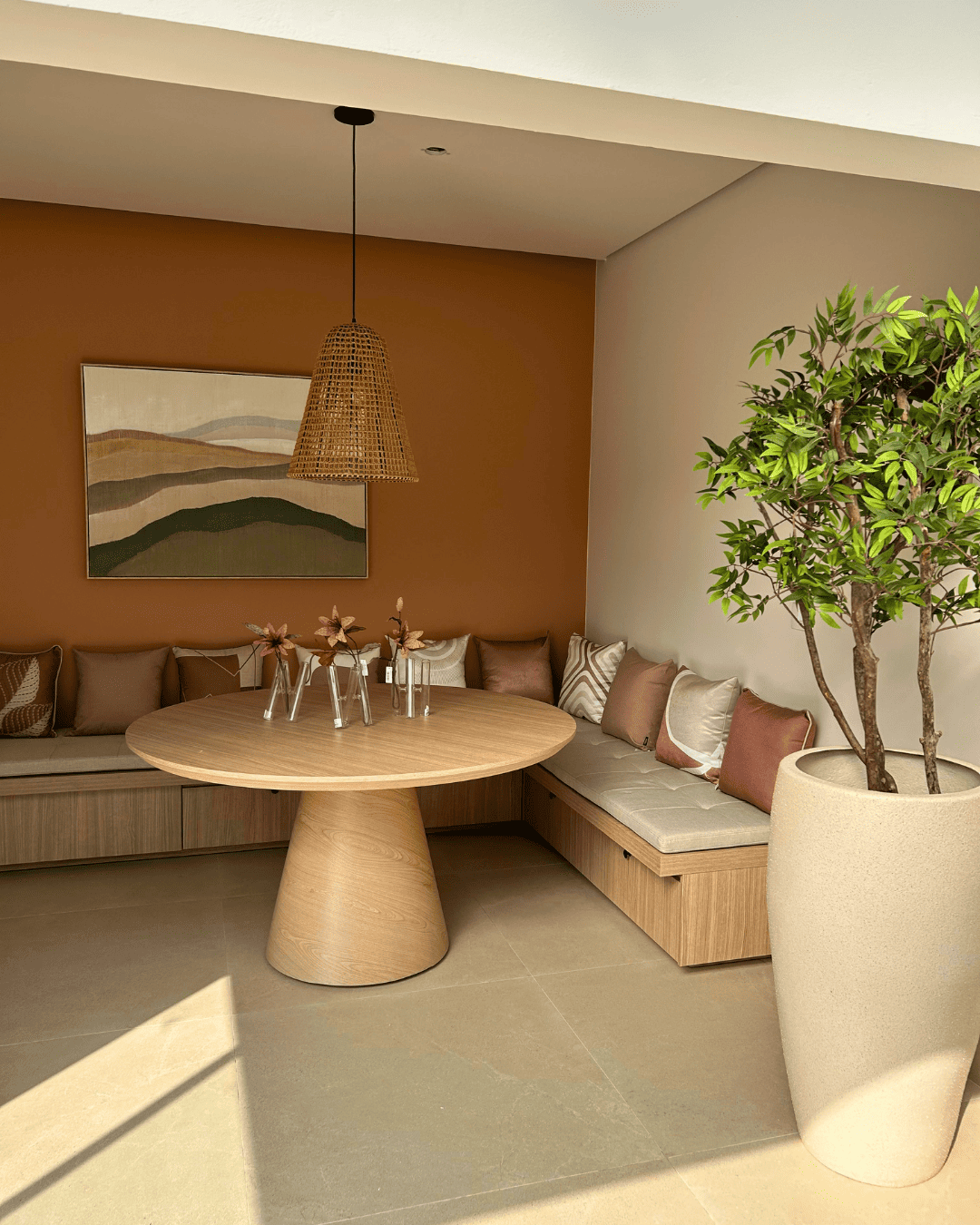 O tom terroso da parede reforça a sensação de aconchego, em harmonia com os tons neutros do piso e dos móveis.