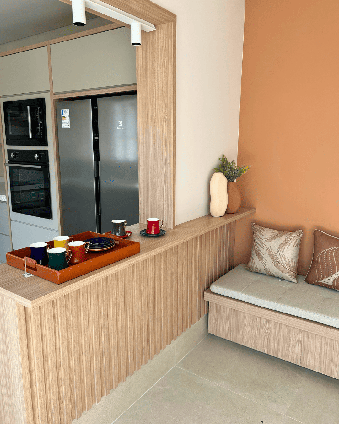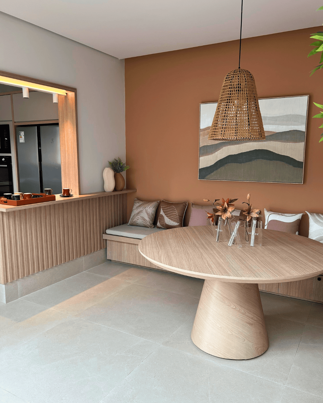 A cozinha se integra ao espaço de jantar e ao cantinho gourmet com texturas amadeiradas e pendente de fibra natural.