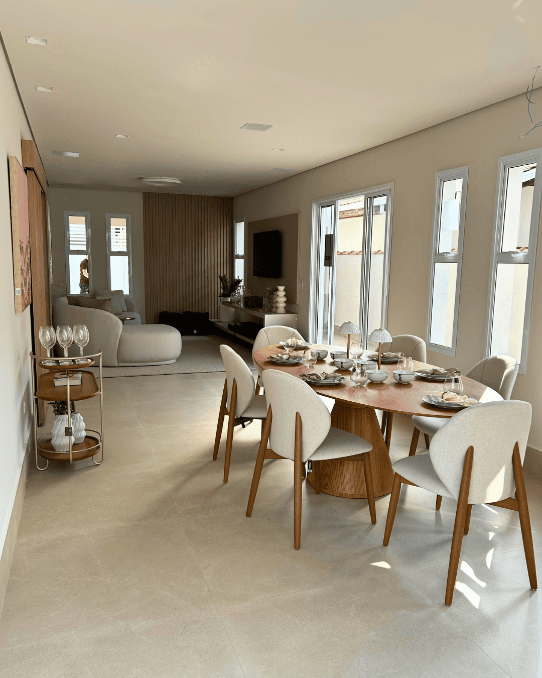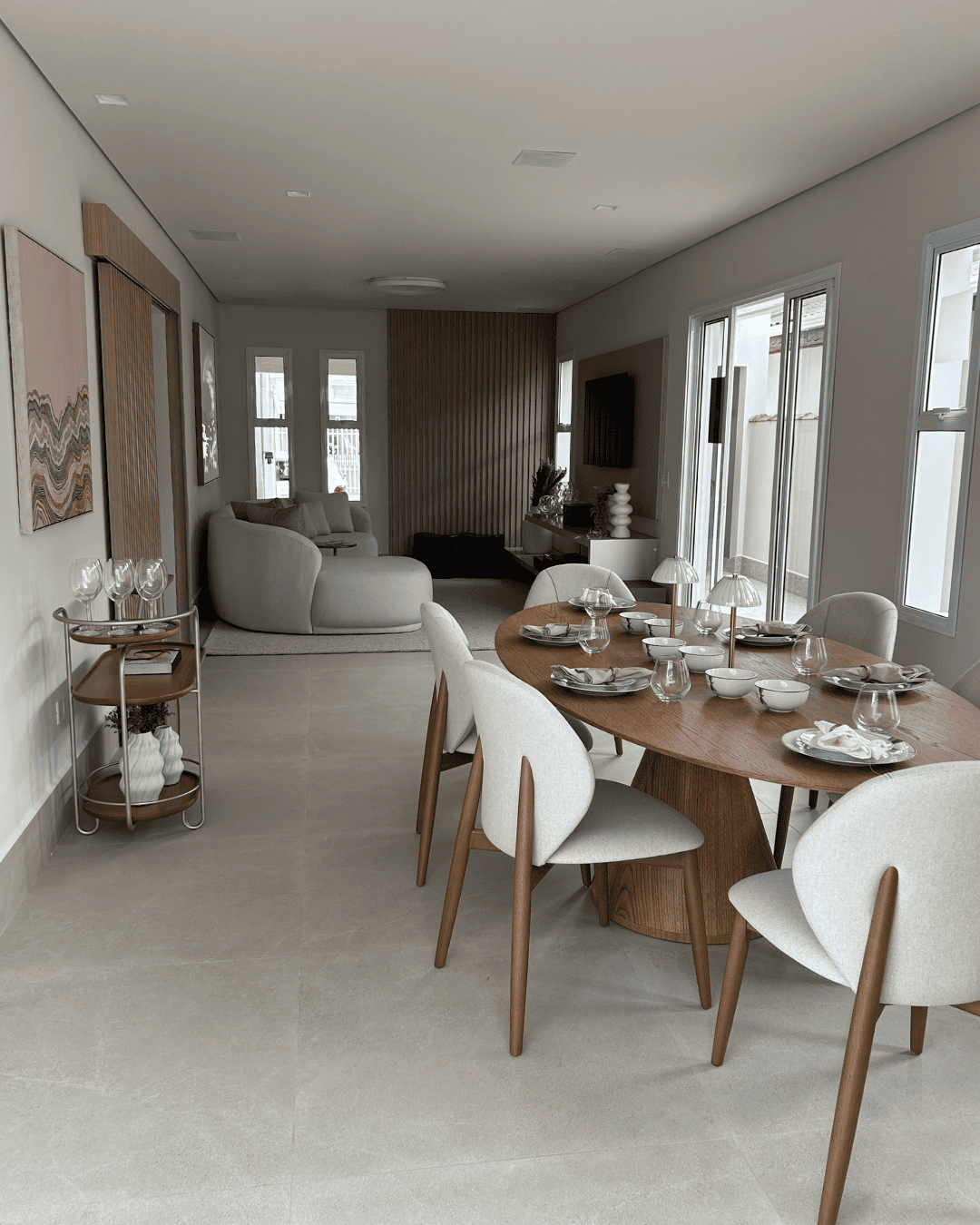 A ambientação integra sala de estar, sala de jantar, cozinha e área de convivência, mantendo uma identidade visual harmônica em todos os ambientes.