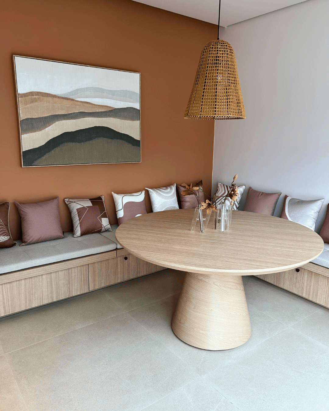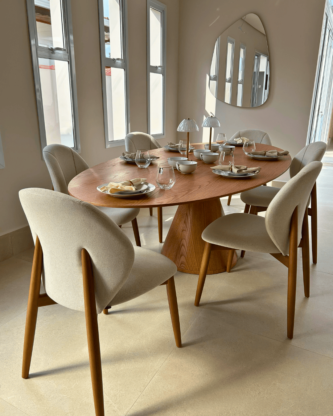 Com uma mesa oval em madeira natural e cadeiras estofadas em tons neutros, a sala de jantar se torna um dos grandes destaques do projeto.