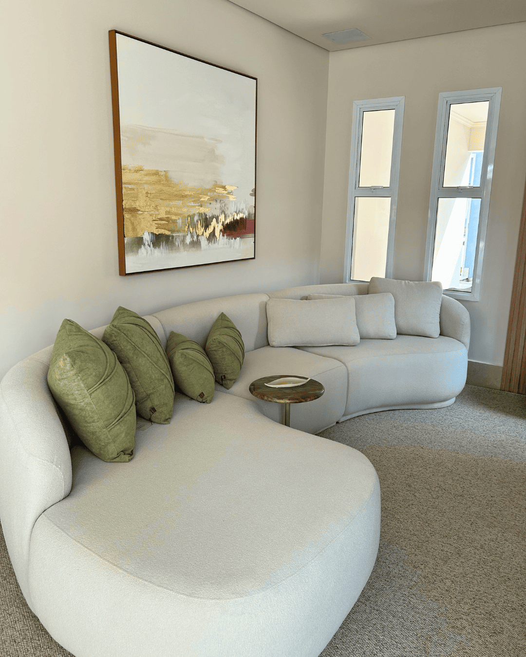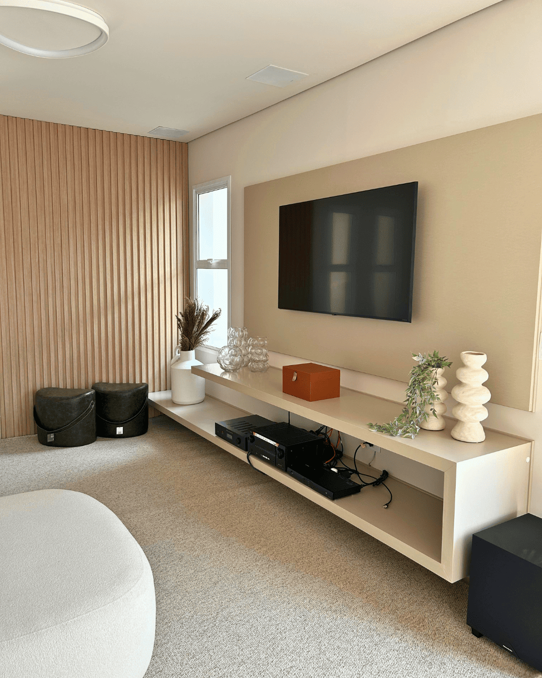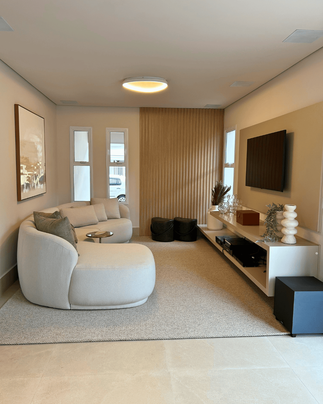 Na sala de estar, o destaque é o sofá curvo em tecido neutro, que cria uma atmosfera orgânica e sofisticada. A parede ripada em madeira traz textura e aconchego, enquanto o painel de TV com elementos claros mantém o ambiente leve.