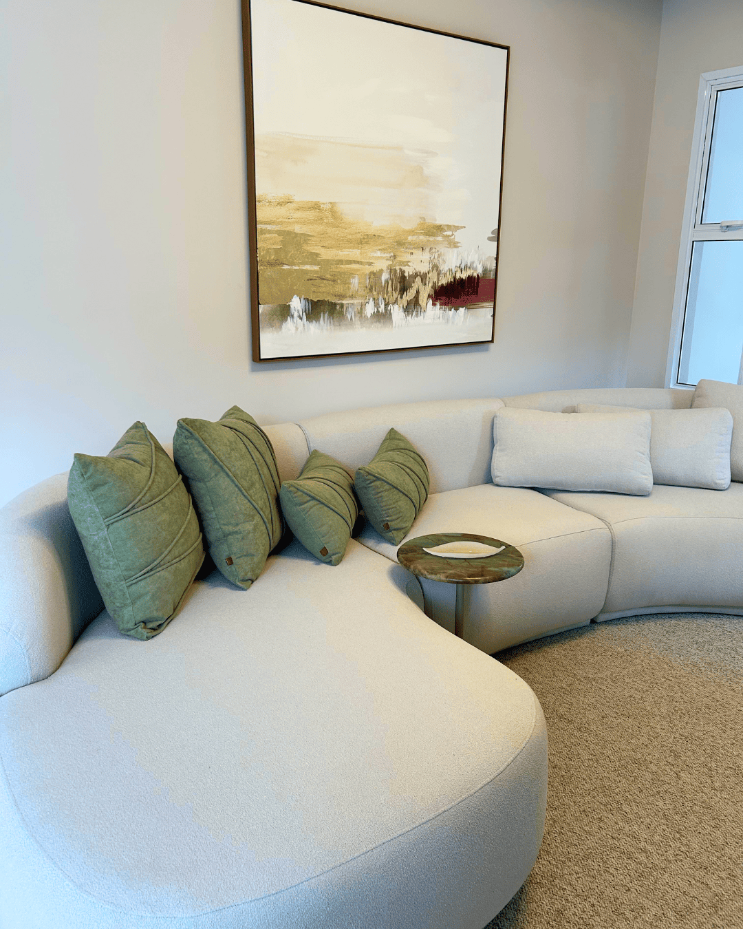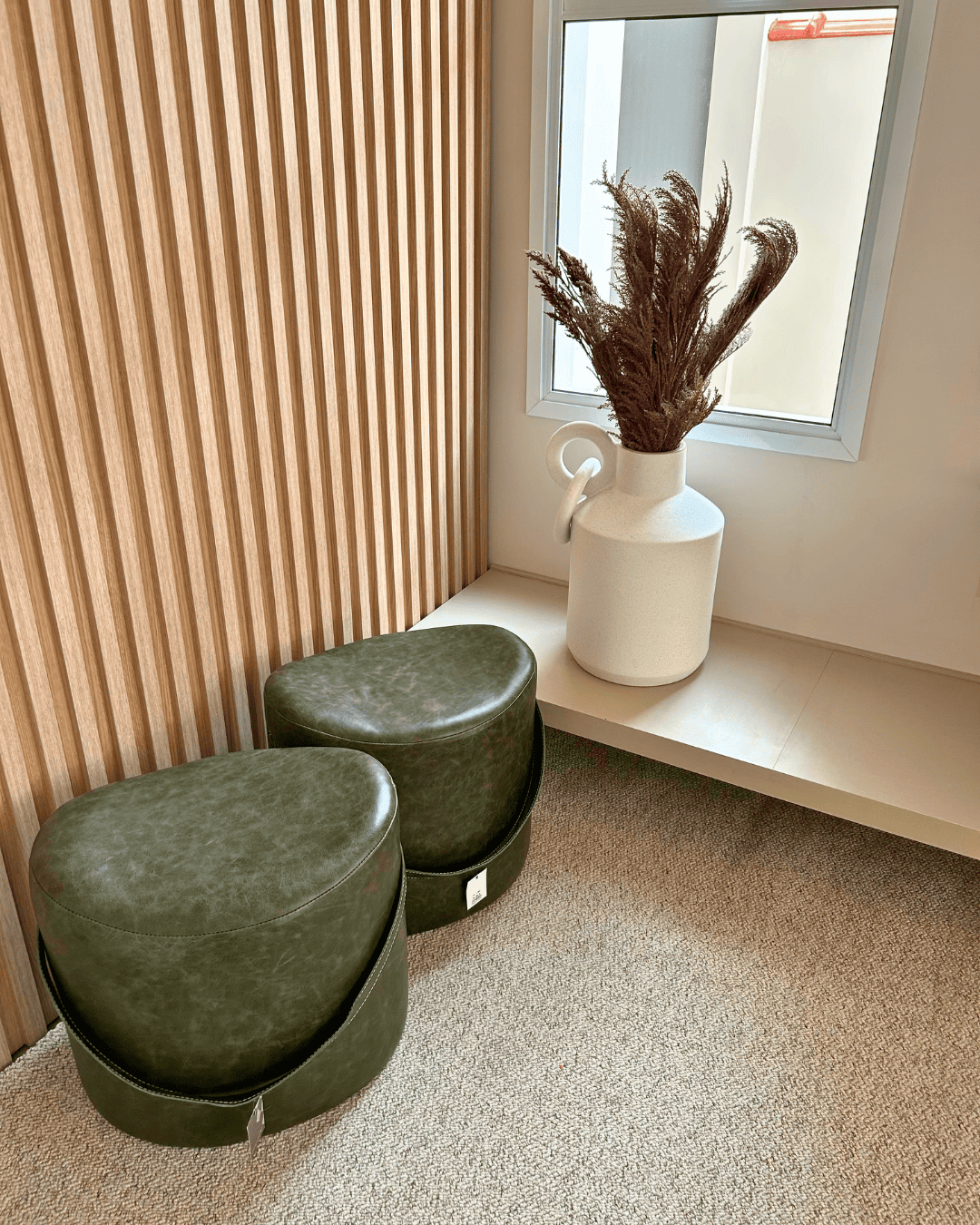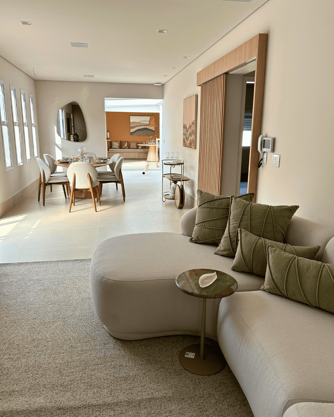 Cada ambiente recebeu atenção especial nos detalhes decorativos — almofadas em tons terrosos, vasos orgânicos, quadros modernos e pufes em verde oliva completam o visual contemporâneo e elegante.