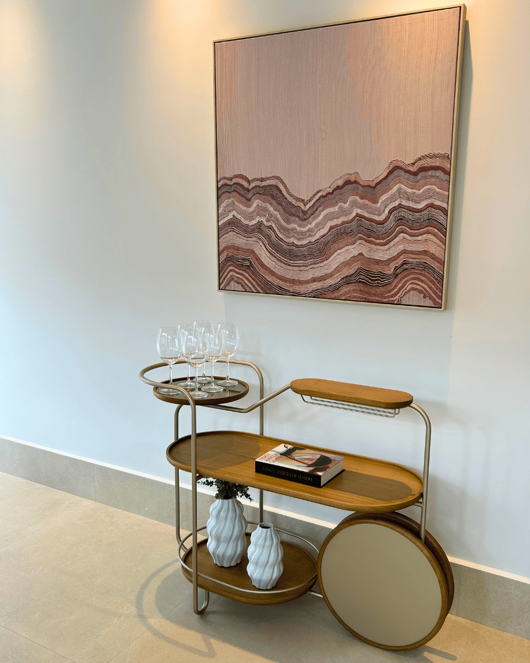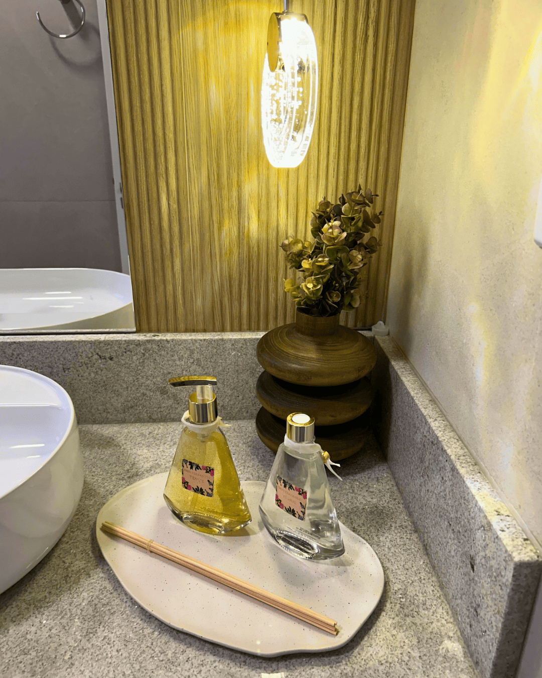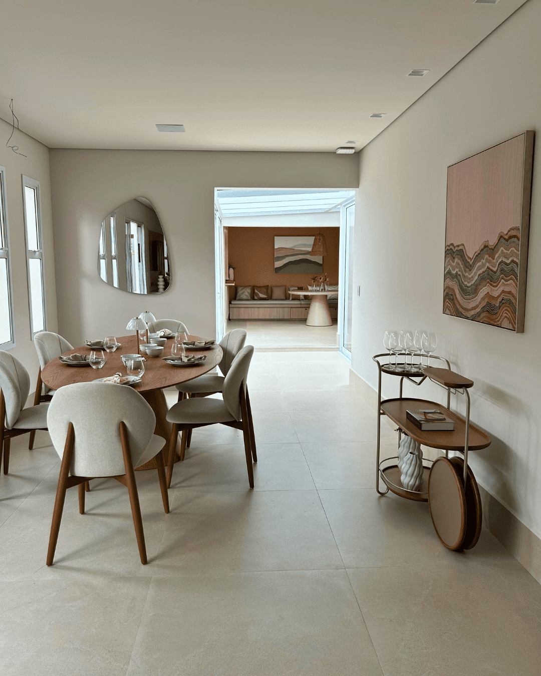 O espelho orgânico amplia a sensação de espaço, e a iluminação pontual cria um clima acolhedor, ideal para receber amigos e familiares.