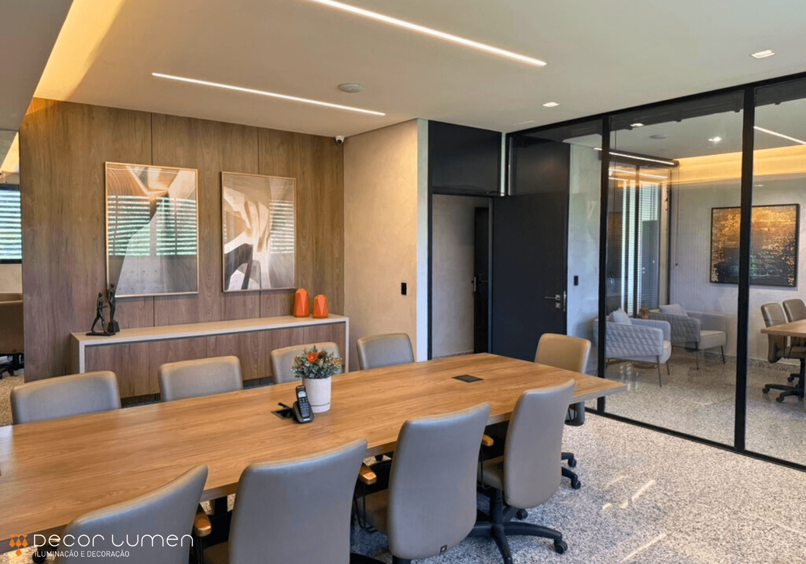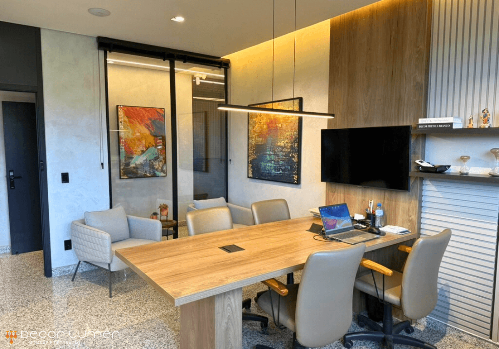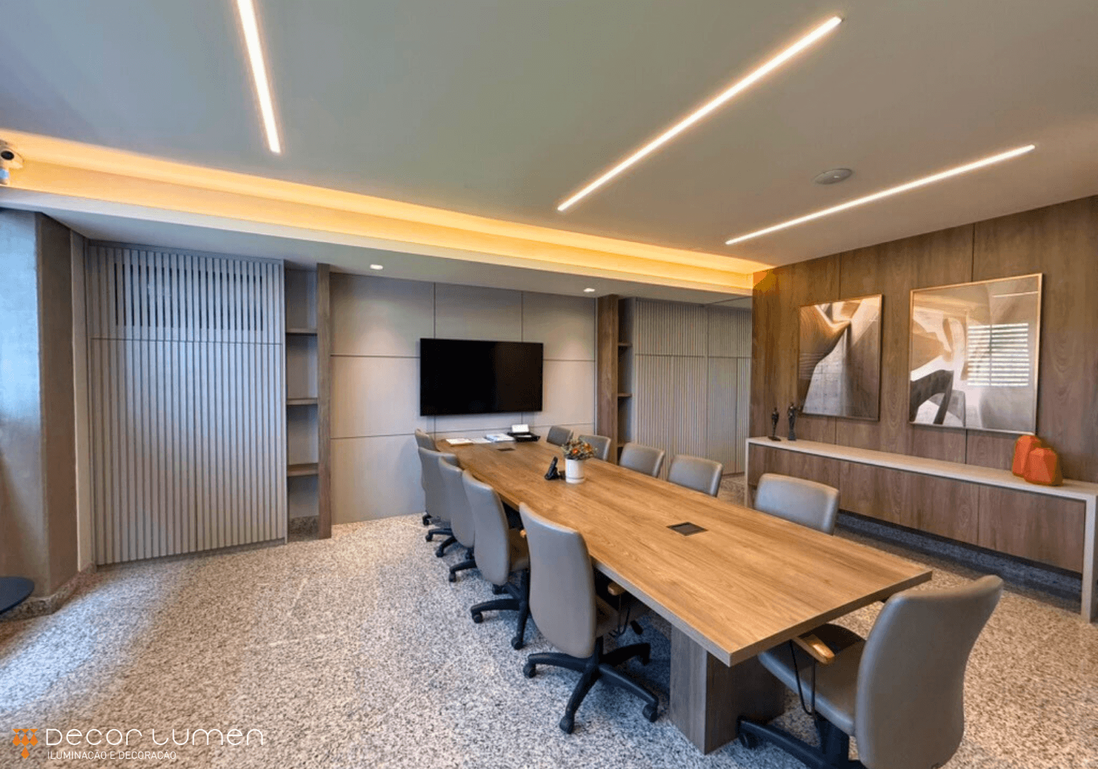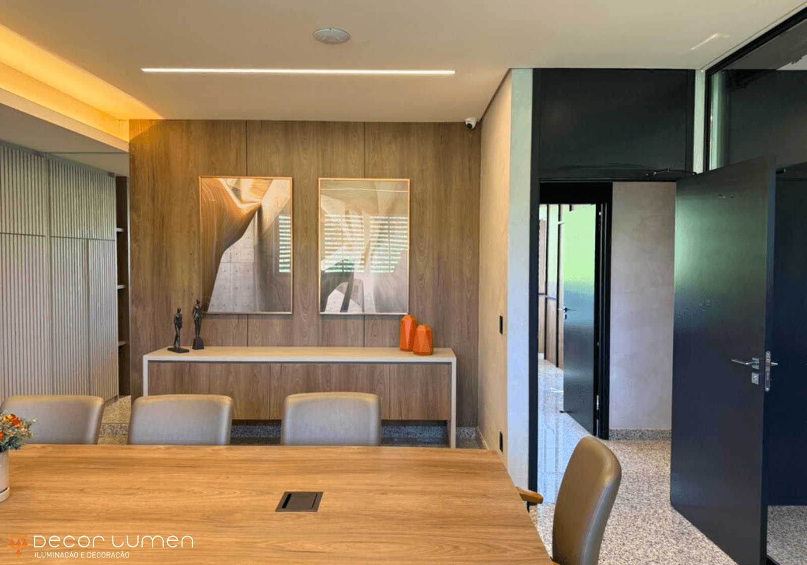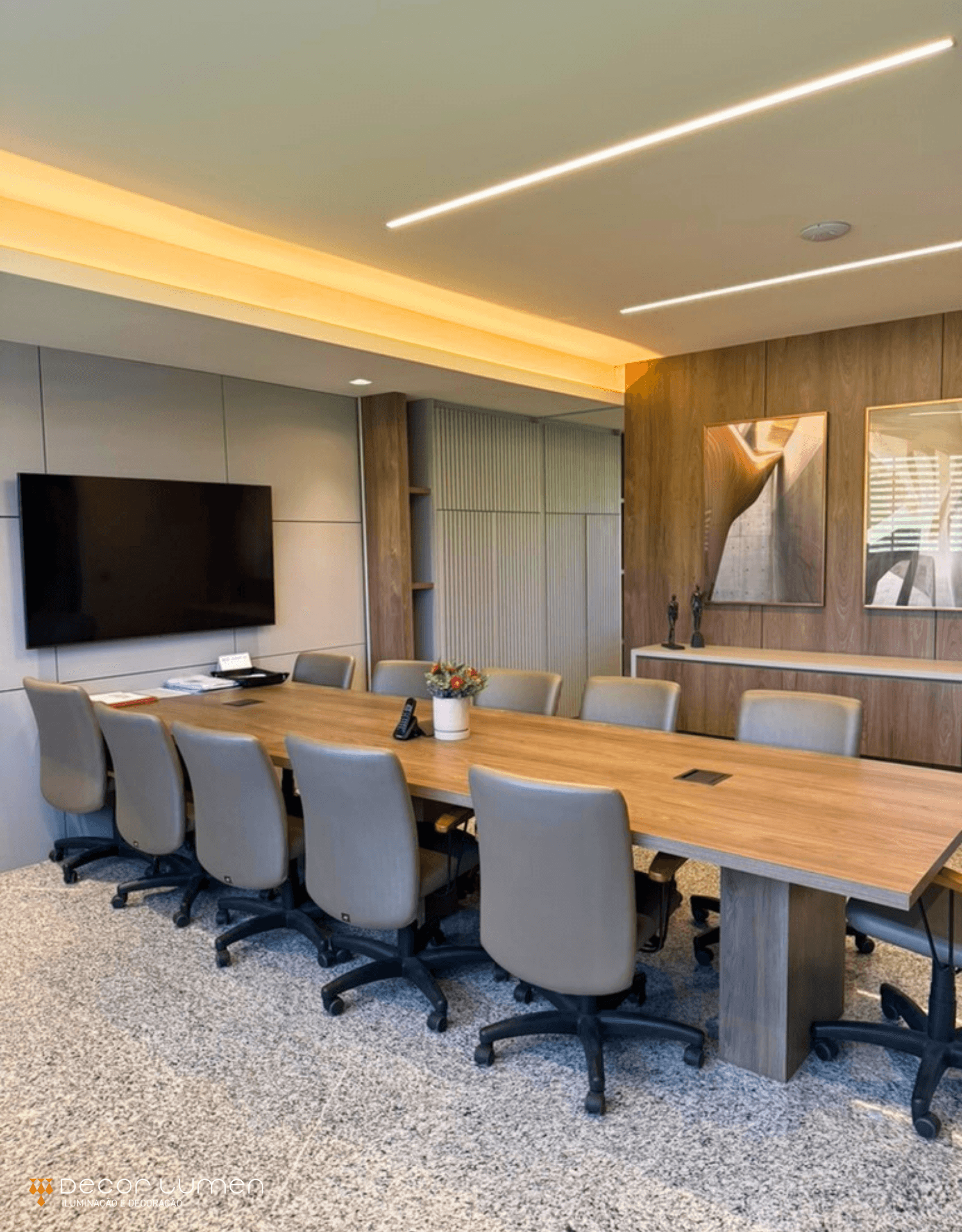 O destaque do projeto é a sala de reunião, com uma mesa robusta em madeira, cadeiras ergonômicas e iluminação difusa e linear, proporcionando conforto visual durante encontros e apresentações. O espaço conta ainda com obras de arte em tons neutros e elementos decorativos que equilibram sobriedade e design.