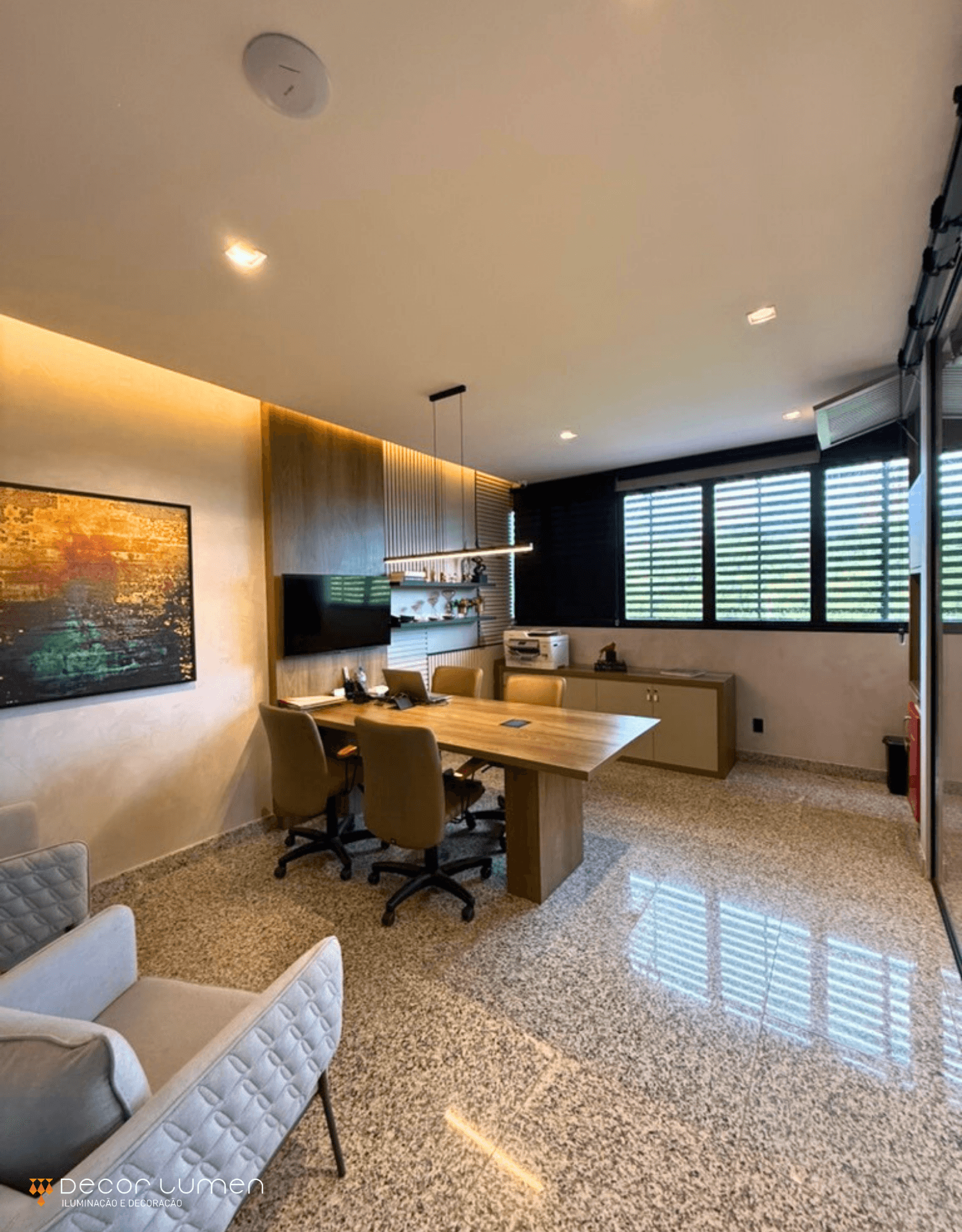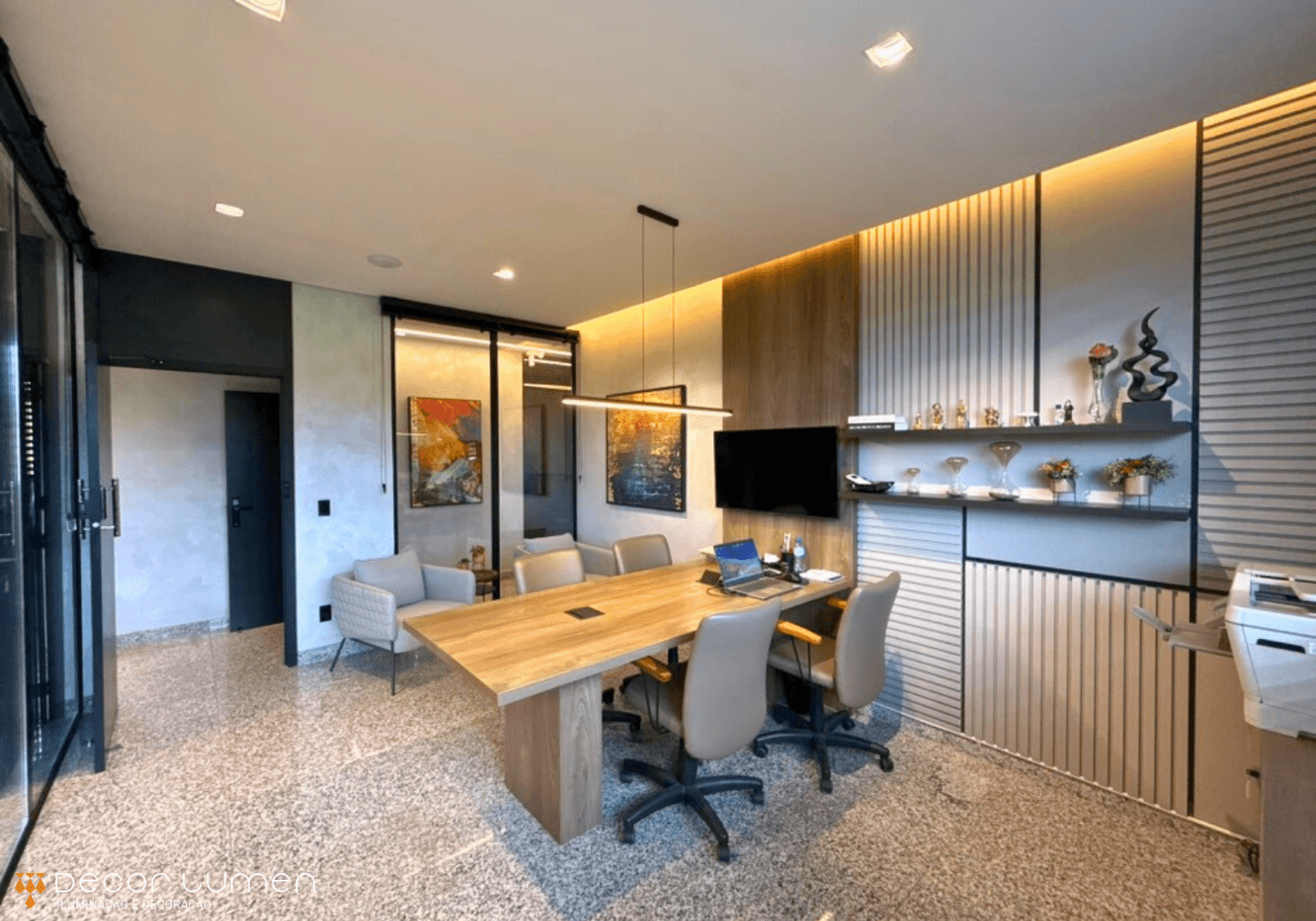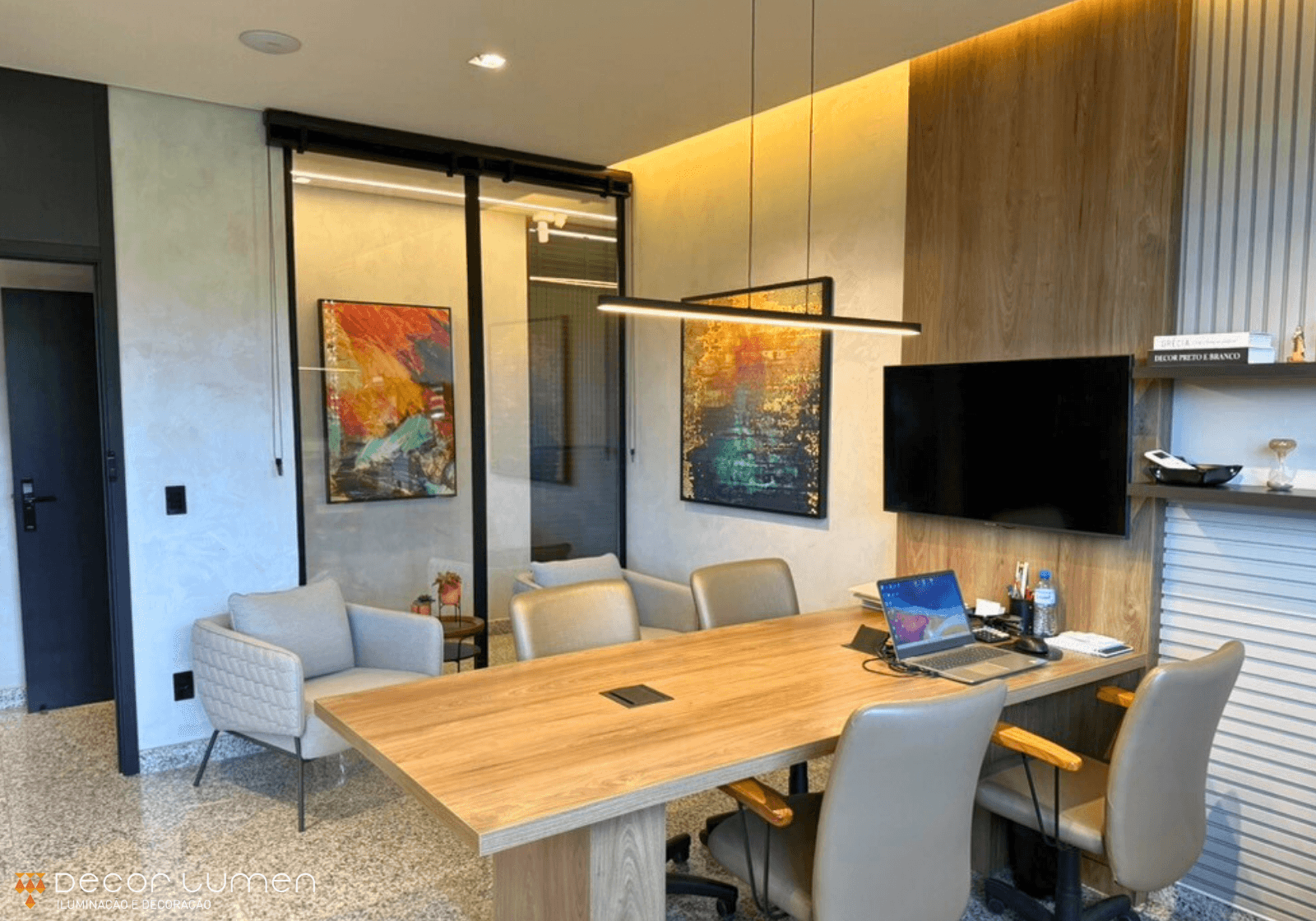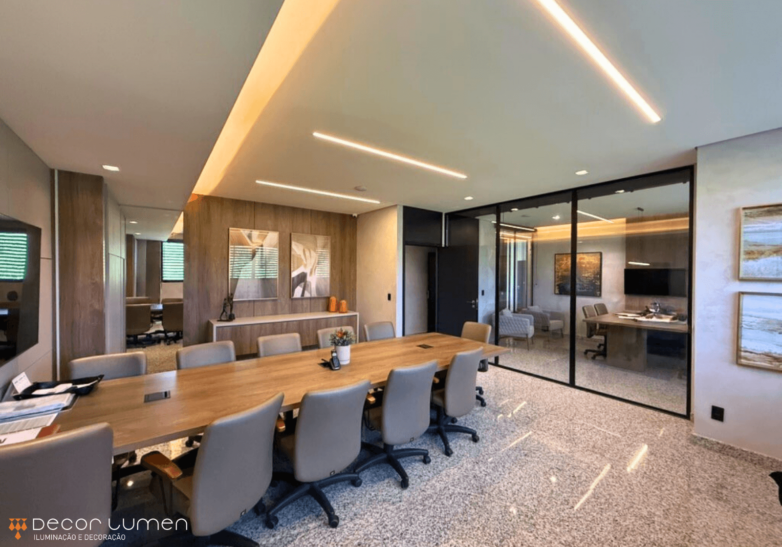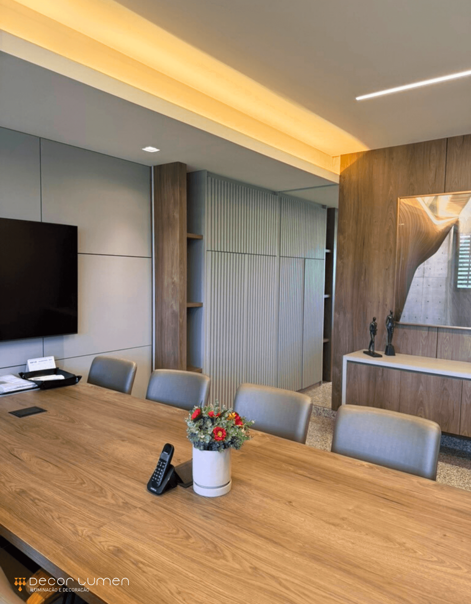 O destaque do projeto é a sala de reunião, com uma mesa robusta em madeira, cadeiras ergonômicas e iluminação difusa e linear, proporcionando conforto visual durante encontros e apresentações. O espaço conta ainda com obras de arte em tons neutros e elementos decorativos que equilibram sobriedade e design.