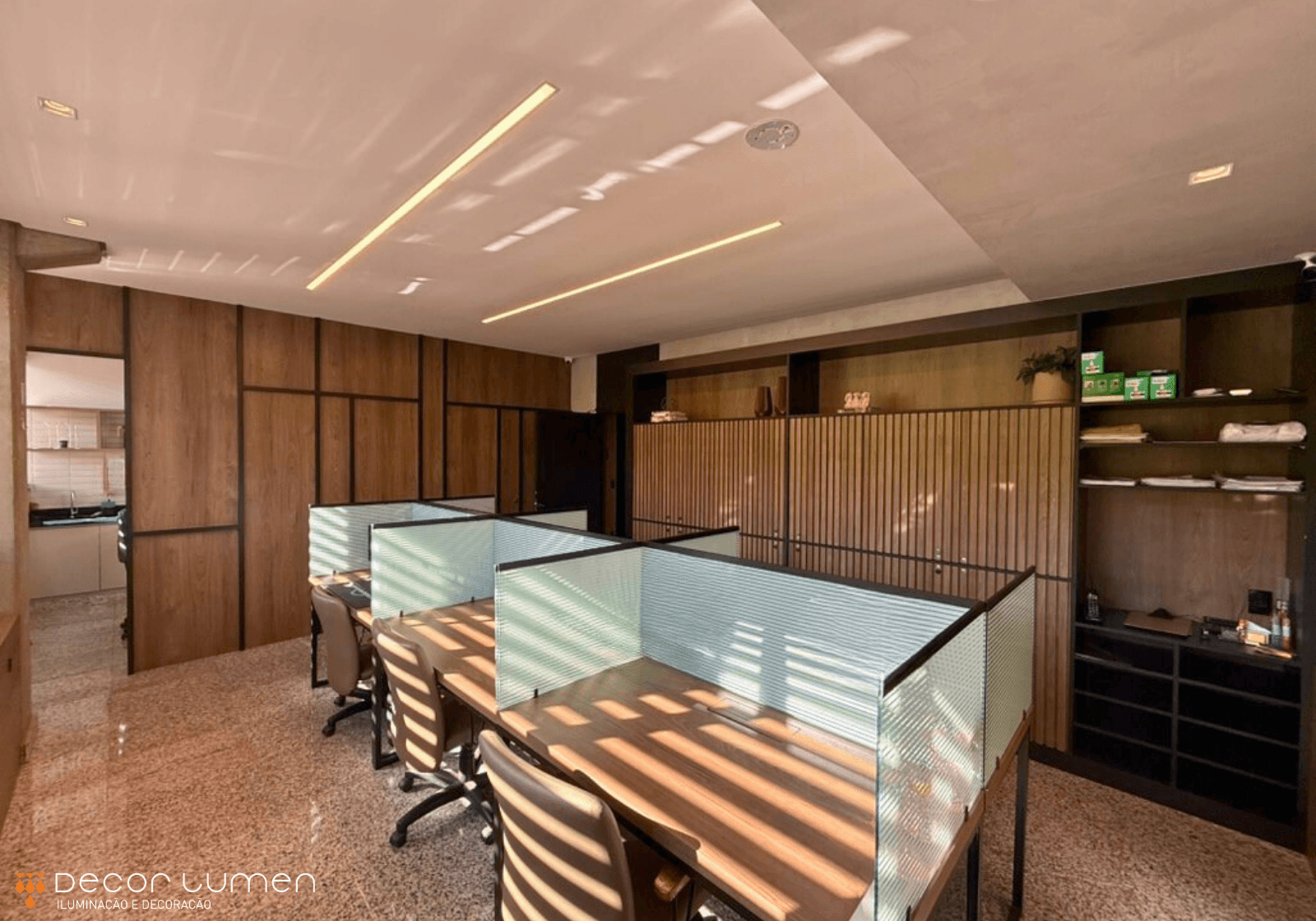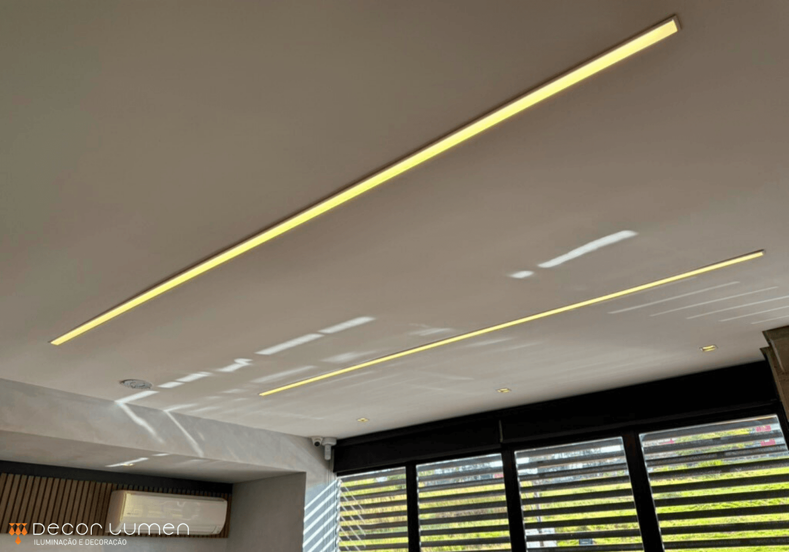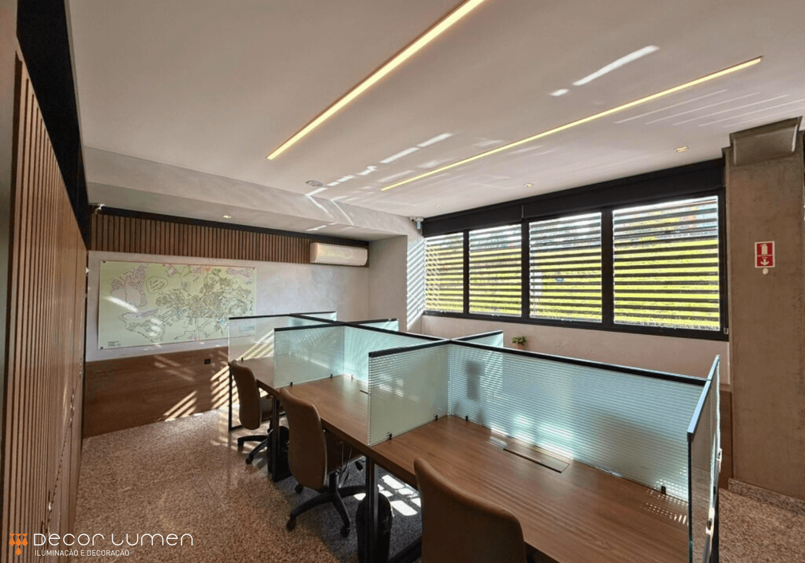 As luminárias lineares embutidas foram utilizadas tanto em sancas quanto em rasgos no forro, criando uma luz contínua e uniforme, ideal para áreas de circulação e salas de reunião.