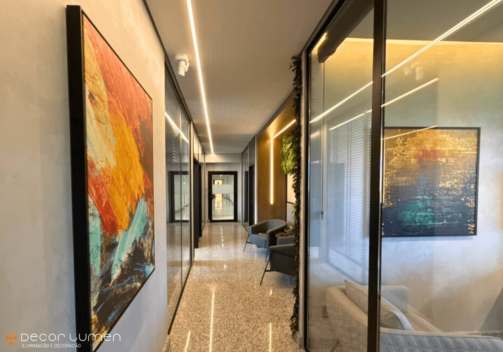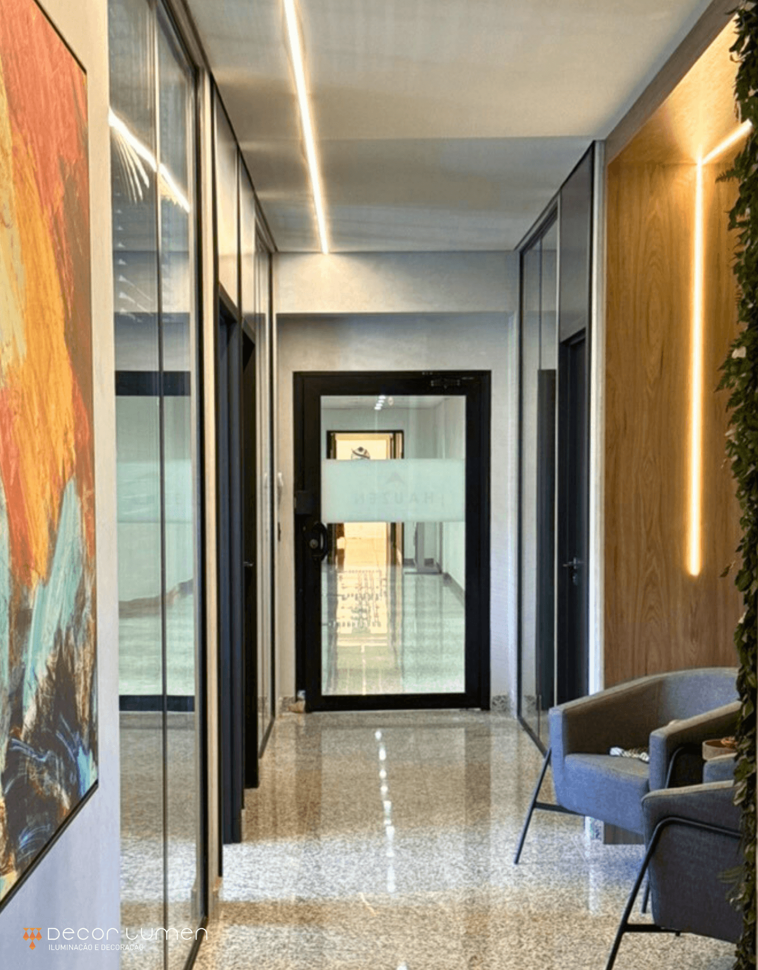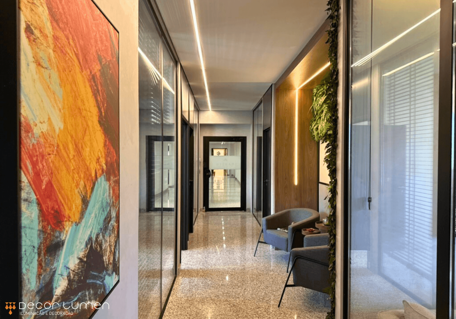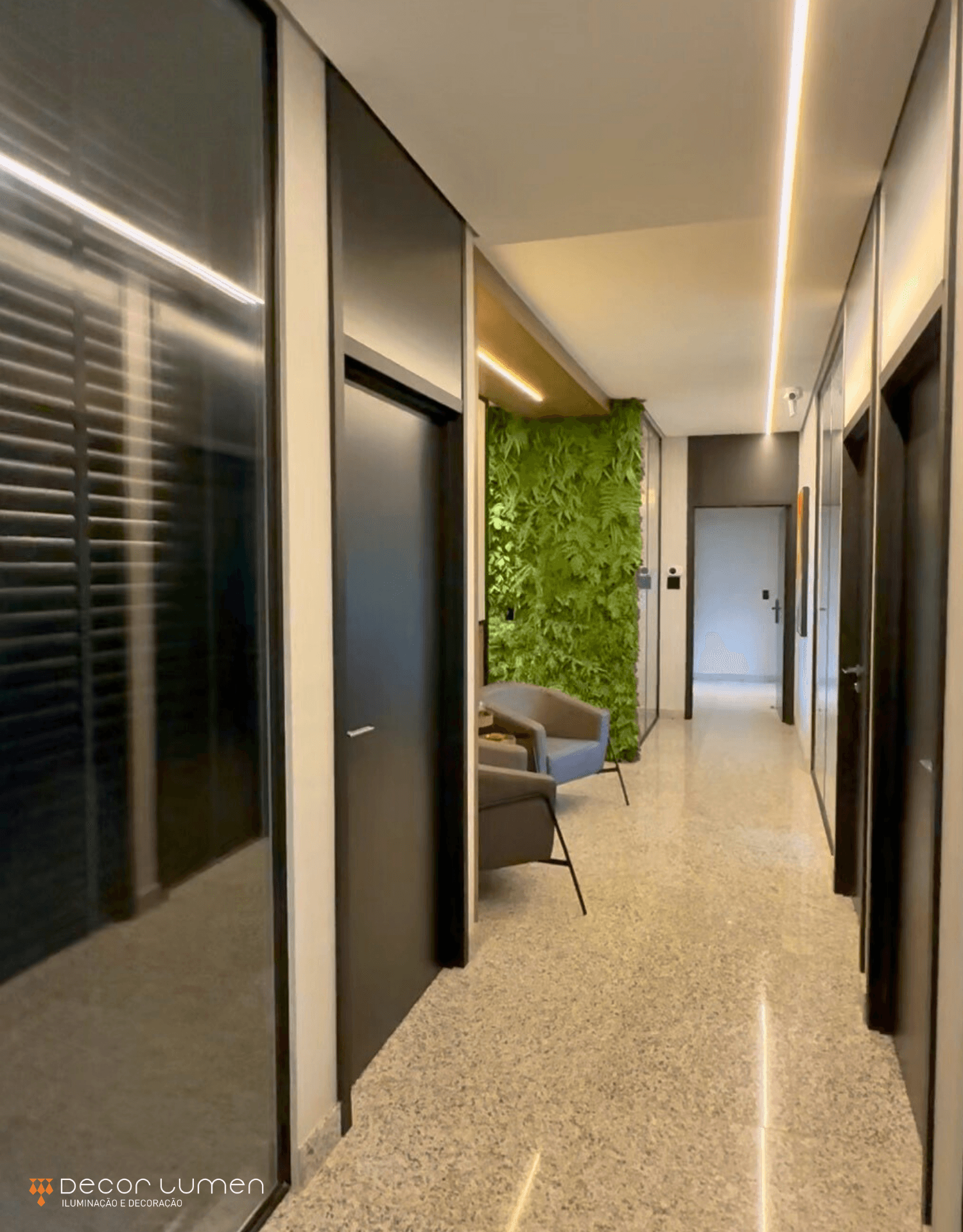 Os corredores receberam iluminação embutida contínua, que valoriza o caminho e realça os painéis em madeira e vegetação natural. O contraste com o piso granilite e as portas em vidro reforça o estilo corporativo contemporâneo.