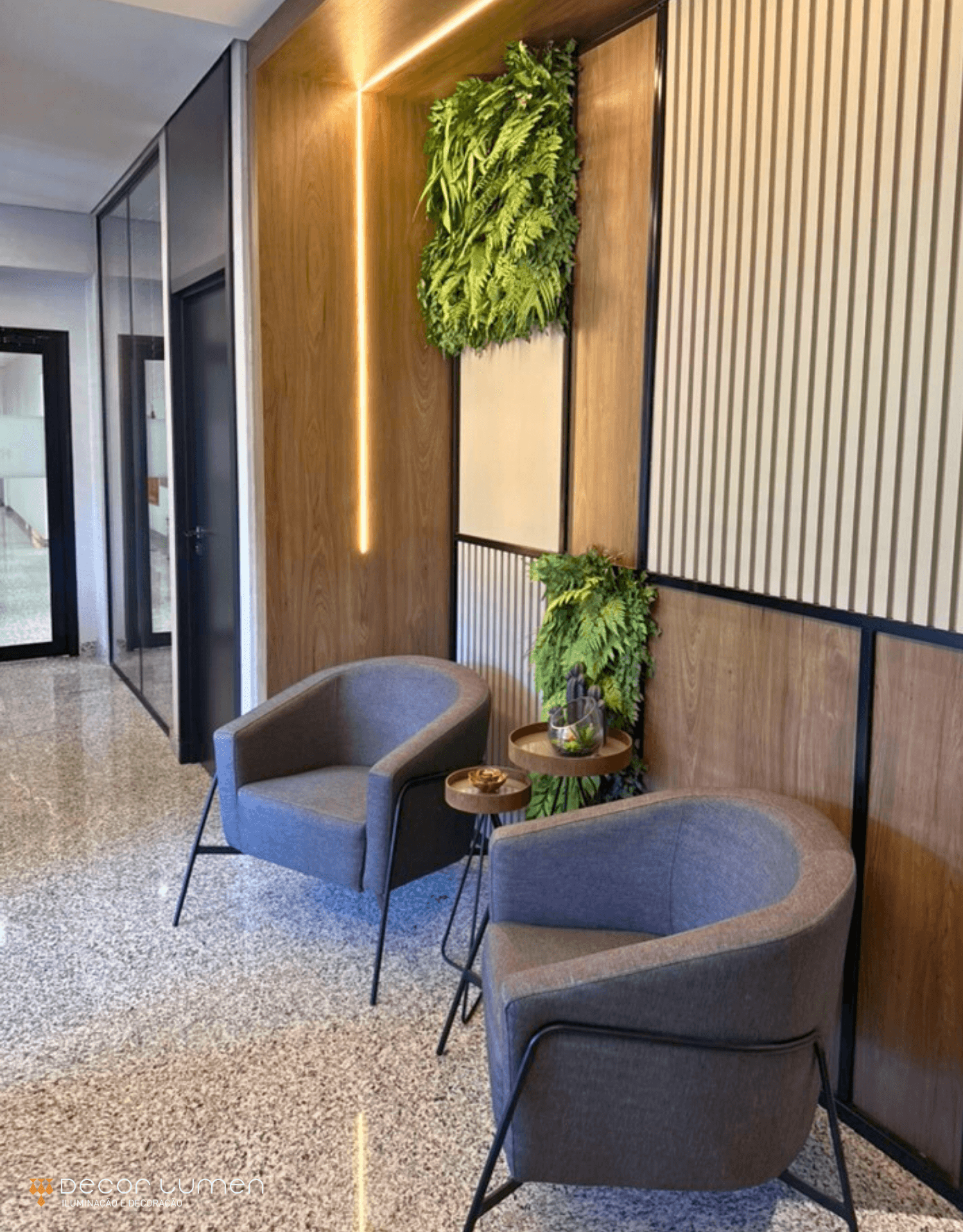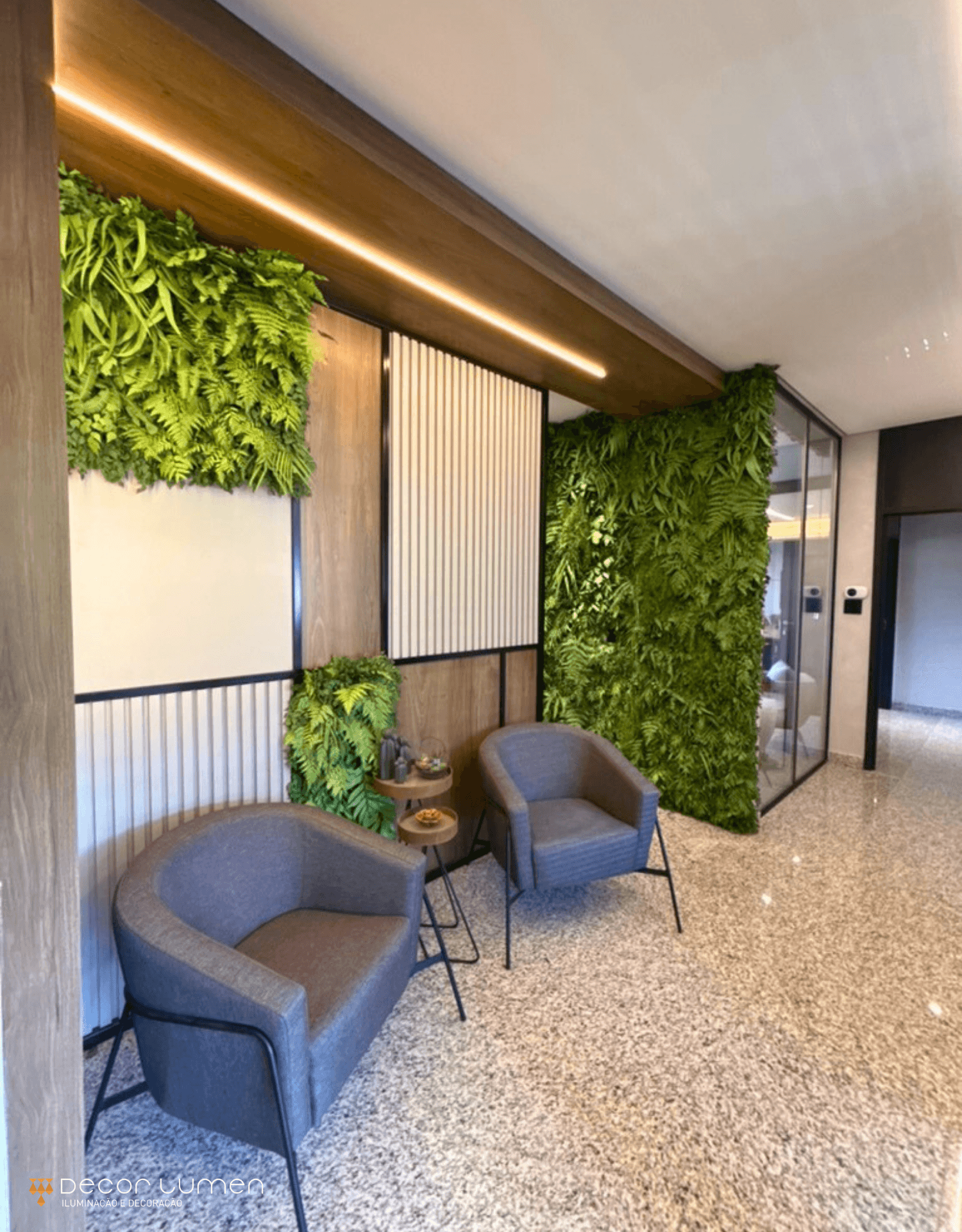 A recepção combina poltronas confortáveis, painéis com vegetação natural e detalhes em madeira e metal, transmitindo uma atmosfera acolhedora para quem chega à Hauzen.